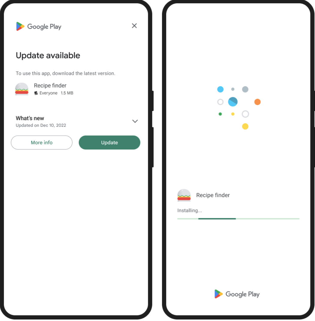 즉시 업데이트는 사용자가 앱을 계속 사용하려면 앱을 업데이트하고 다시 시작해야하는 전체 화면 플로우입니다.
